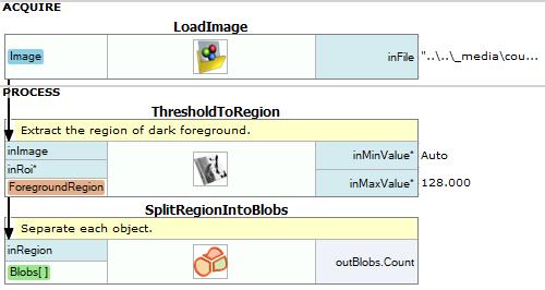 - To extract objects from the image add ThresholdToRegion filter to PROCESS section and set the value of inMaxValue to 128 and inMinBlobArea set to Auto.