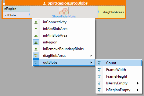 - To get the number of blobs, right-click on outBlobs port and expand outBlobs.Count value.
