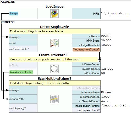 Add CreateCirclePath filter, right-click on inCircle and expand structure fields. Set the value of inPointCount to 50. Connect outCircle.Center with inCircle.Center and set inCircle.Radius to 125 which is the approximate distance between the center of the hole and the teeth of the blade.