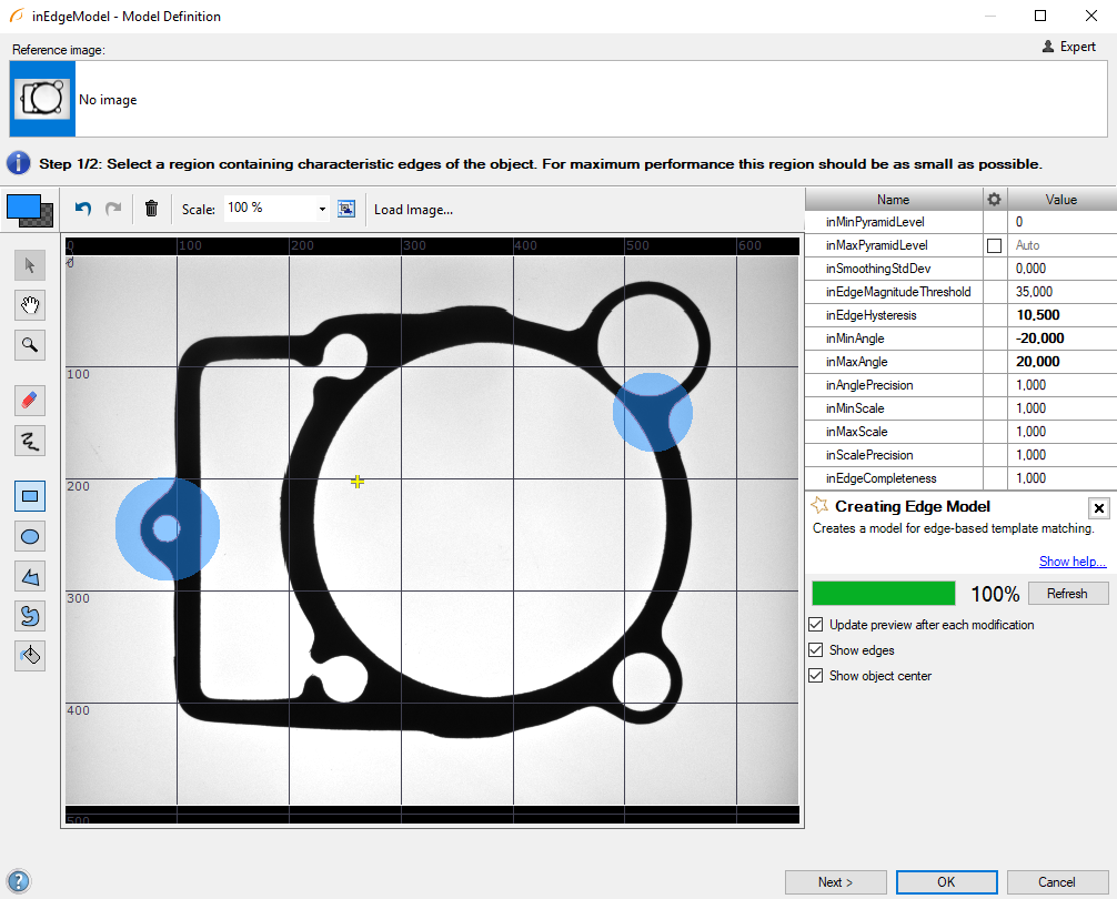 Open a template matching editor on inEdgeModel and make sure to select Expert complexity mode in the top right corner. Select the template region as shown in the picture below. Please note that you can select multiple smaller, separate regions for better rotation detection.