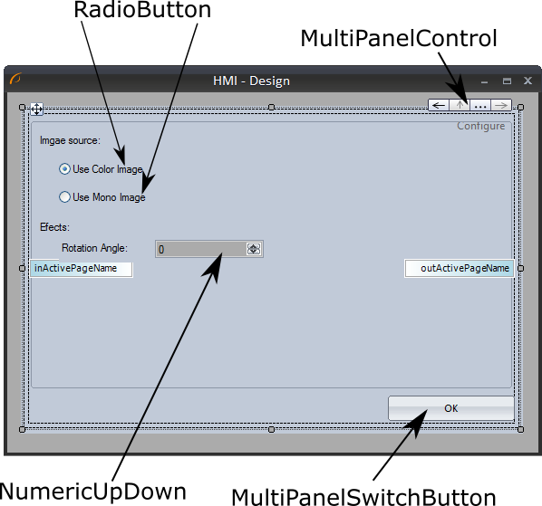 - One MultiPanelSwitchButton named "OK". Set TargetPage property to "Display". This control allows you to go back to main window of HMI.