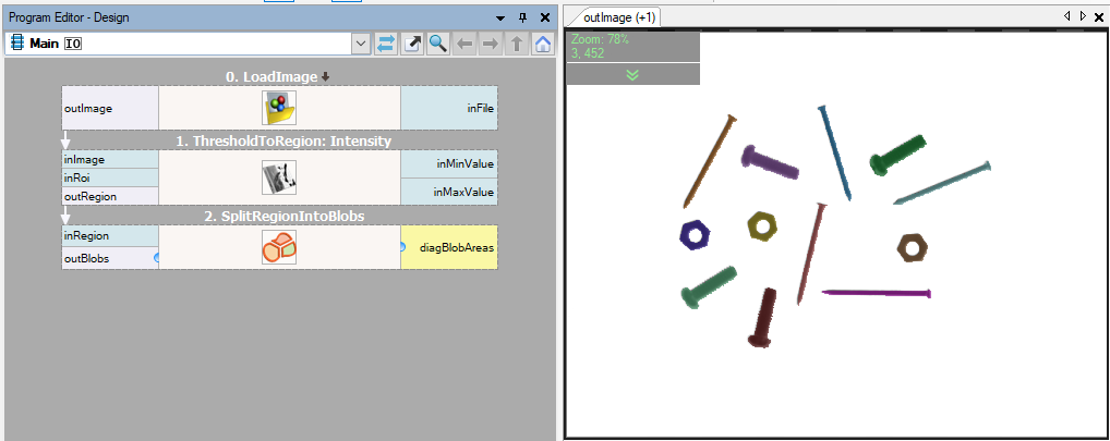 Add LoadImage filter to the project and select the input image path. It is also possible to drag an image file from outside of Adaptive Vision Studio window.