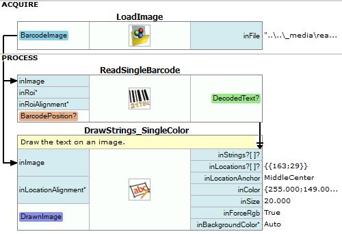 - To draw the recognized value in the image use DrawStrings_SingleColor filter. Set the text position at inLocations and connect outDecodedText with inStrings.