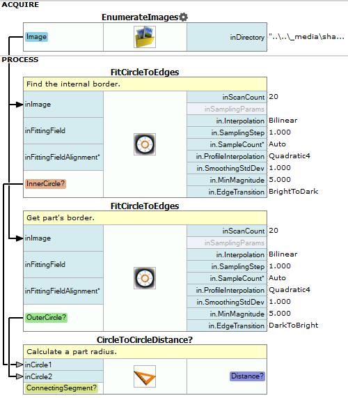 To detect the outer border of the part, add the other FitCircleToEdges filter. Set inScanCount and the inFittingField.Width size the same as in the previous filter. Create a circle that is a bit smaller than the perimeter of the object in the image. Change inEdgeScanParams.EdgeTransition to DarkToBright and inFittingMethod to GeometricLandau.