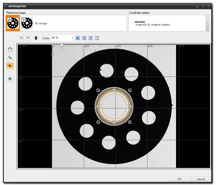 Add the FitCircleToEdges filter and select a scanning circle using the first loaded image as a background. The image below shows the circle editor with the background set and the circle created. The circle is selected with a small margin.