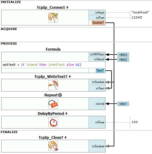 Add the TcpIp_Connect filter to the INITIALIZE section and configure its inPort input.