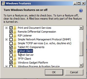 Please, turn it on at Control Panel > Programs > Turn Windows features on or off > Telnet Client.