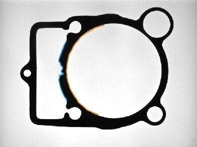 ImageAlongPath performed on the sample image with inAxisType = X and inScanWidth = 50. Blue path on output image was reprojected on original image using PathAlongPath with inAxisType = X, inAxisCoordinate = 25, inInverse = true. ImageAlongPath and PathAlongPath used the same path (the orange one) for transformations.