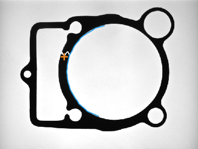 ImageAlongPath performed on the sample image with inAxisType = X, inScanWidth = 50 and path marked with blue. Point marked with blue cross on the output image was calculated by ScanSingleEdge. Original point (marked with orange cross) was calculated using PointAlongPath with inAxisType = X, inAxisCoordinate = 25, inInverse = true and position of detected point. ImageAlongPath and PointAlongPath used the same path for transformations.