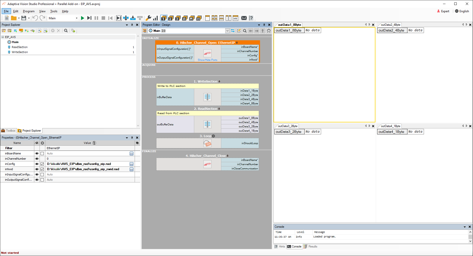 To use EtherNetIP filters in Aurora Vision Studio first you need to attach configuration files from SYCON.net to Hilscher_Channel_Open_EthernetIP filter in INITIALIZE section. The configuration files generated in the previous step are now required in inConfig (xxx.nxd) and inNwid (xxx_nwid.nxd) properties of that filter. Below you can find two Step macrofilters responsible for writing data to PLC and receiving data from it. To have cyclic communication you have to place Loop macrofilter at the end of PROCESS section. In FINALIZE section place Hilscher_Channel_Close macrofilter.