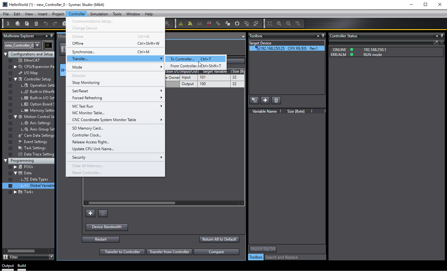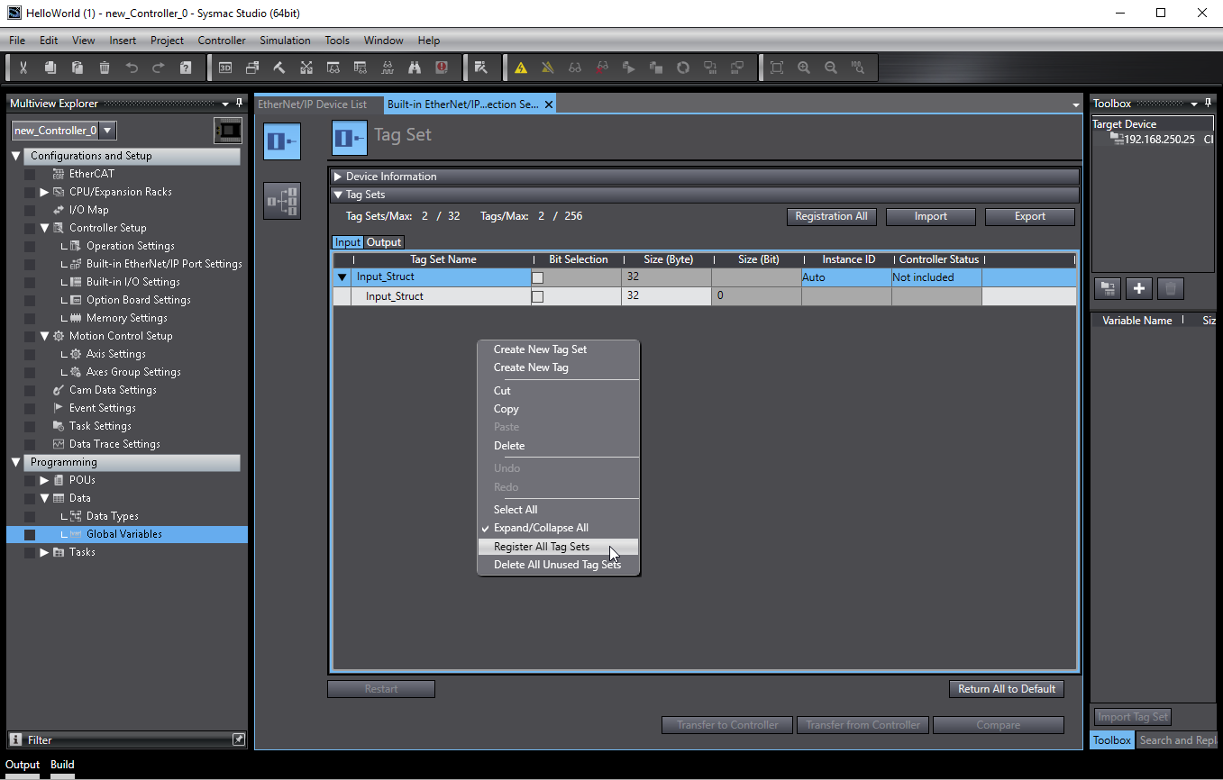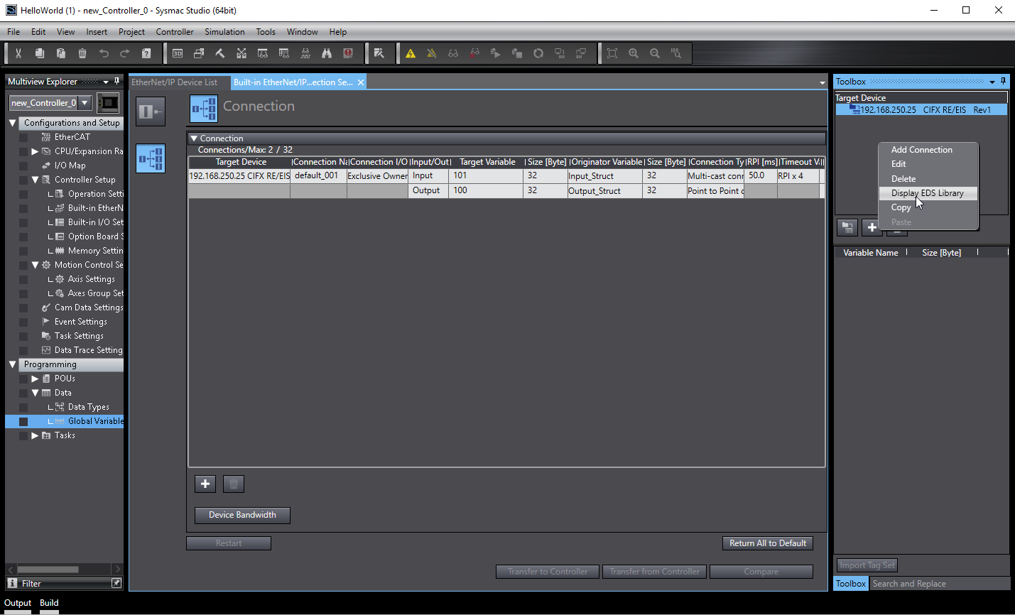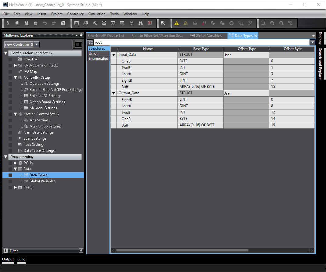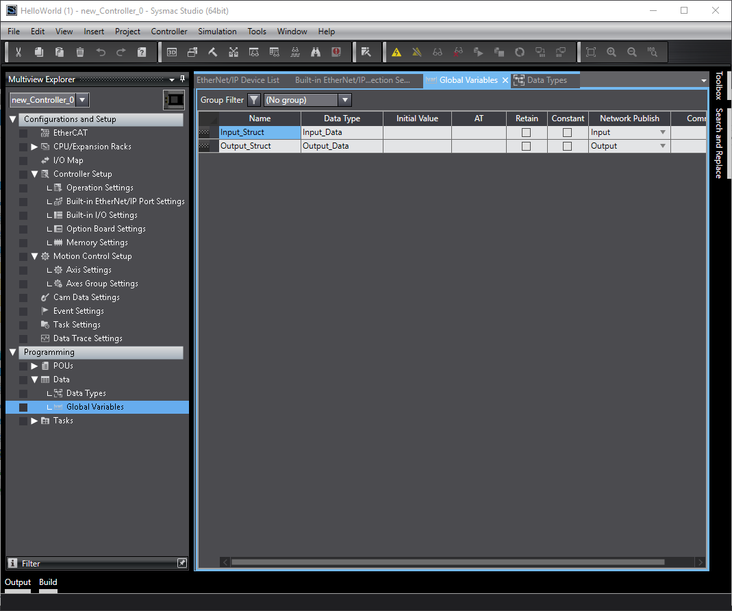 Below you will find an example configuration process for EtherNet/IP PLC Omron NXJP2-9024DT in Sysmac Studio software.