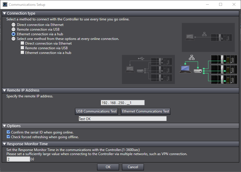 For this moment it is essential to connect with a PLC device, to do this in Sysmac Studio you need to navigate to "Controller -> Communication Setup...". There might be an error in Ethernet Communication Test if your network card is configured as DHCP (Configuration of the network card section in this tutorial). If communication with PLC is established you will receive "Test OK".