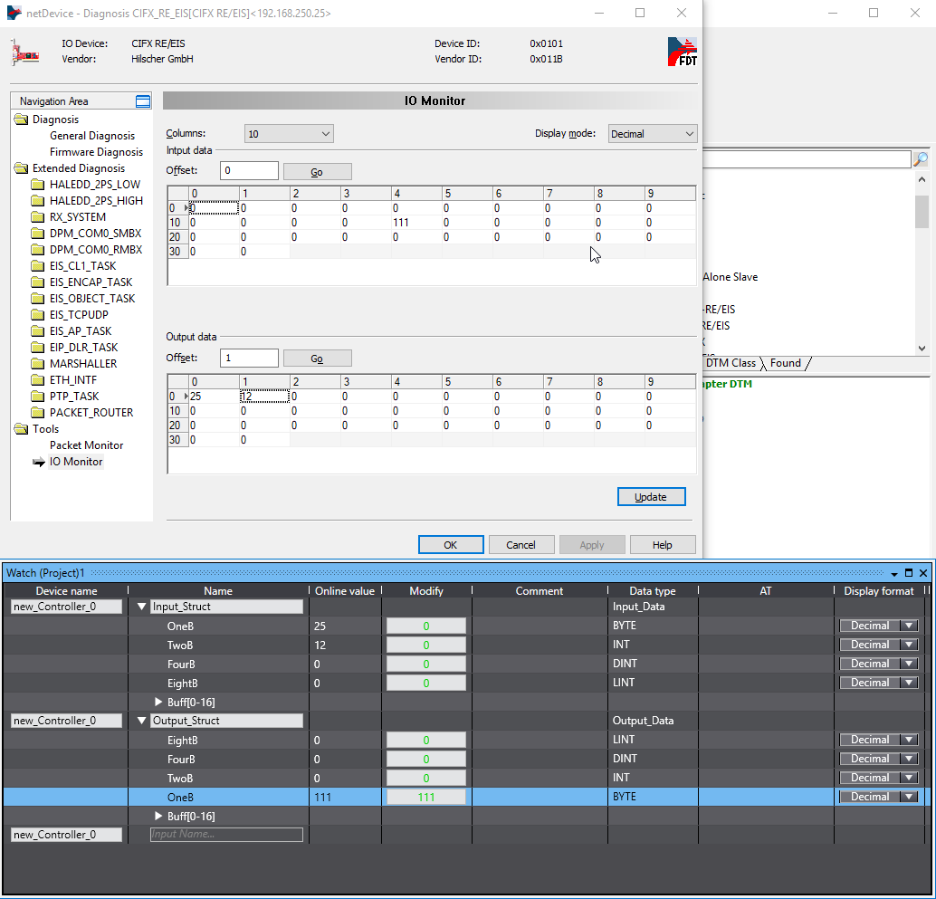 Below you can find a test of input and output memory using a watchtable in Sysmac Studio and IO Monitor in SYCON.net. To turn on IO Monitor you have to right-click on the icon of the card in SYCON.net project and click "Connect". Then double click this icon and navigate to "Tools -> IO Monitor". By clicking "Update" you can send a changed frame to the PLC.