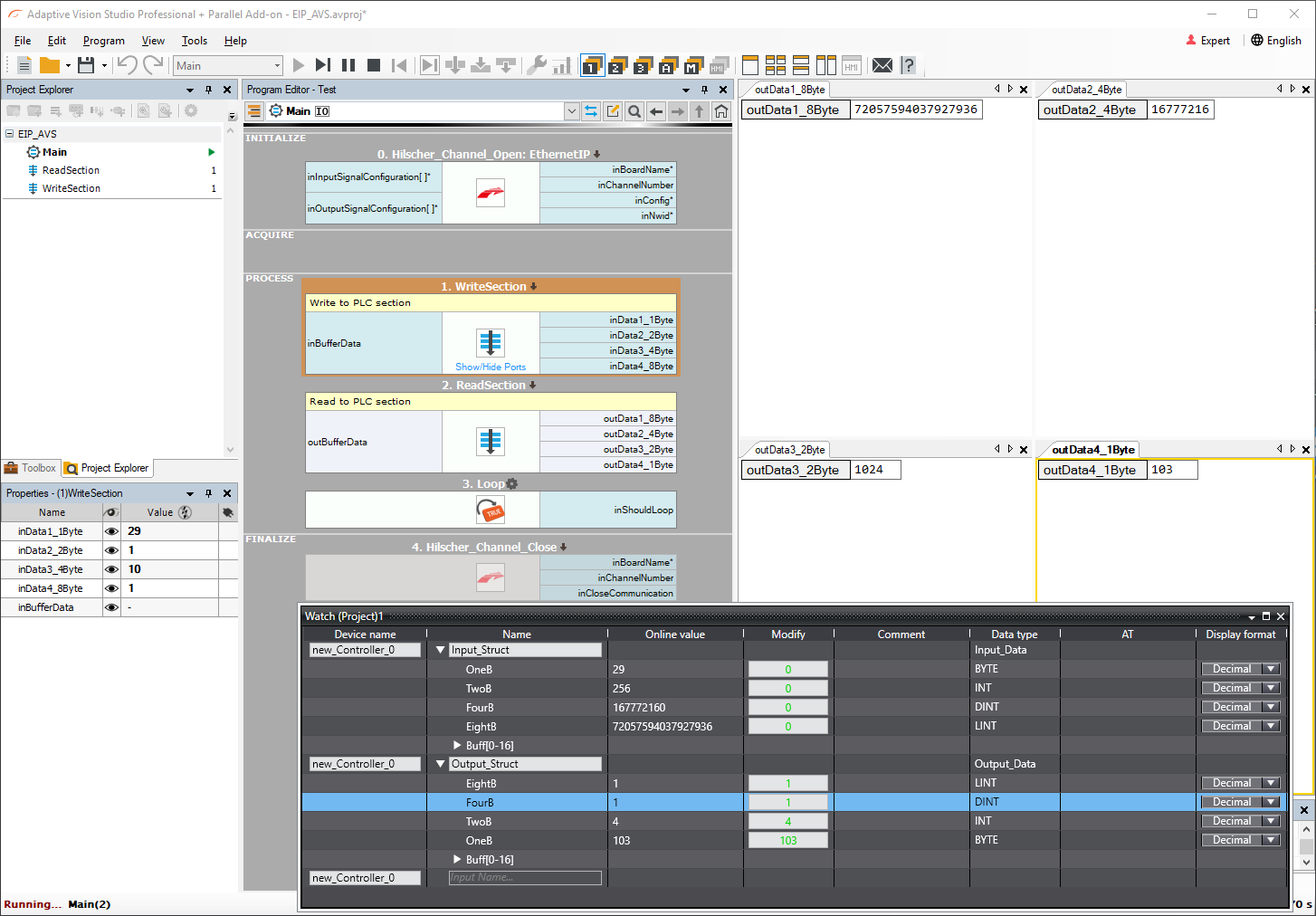 Below is presented reading and writing to PLC with Aurora Vision Studio and Sysmac Studio watchtable. Decimal values of variables are dependent on the data type used.