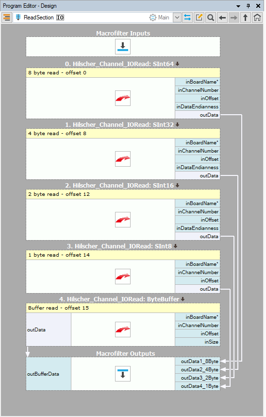 In step macrofilter ReadSection you can find for example Hilscher_Channel_IORead_SInt8 filter which writes 8 bytes of signed data to the predefined memory area. Using different offsets for each macrofilter enables access to different variables created in PLC (Example configuration of Ethernet/IP PLC section of this tutorial).