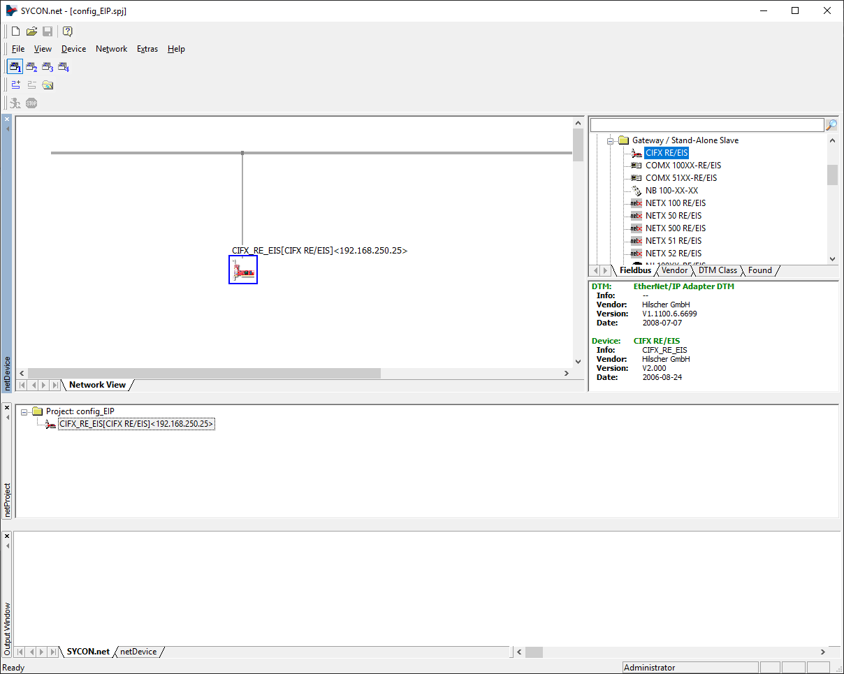 Configuration files are generated in SYCON.net software. Firstly, pick a proper device and drag it to the gray bus on the "Network View". This device you can find navigating to "EtherNet/Ip -> Gateway / Stand - Alone Slave -> CIFX RE/EIS".