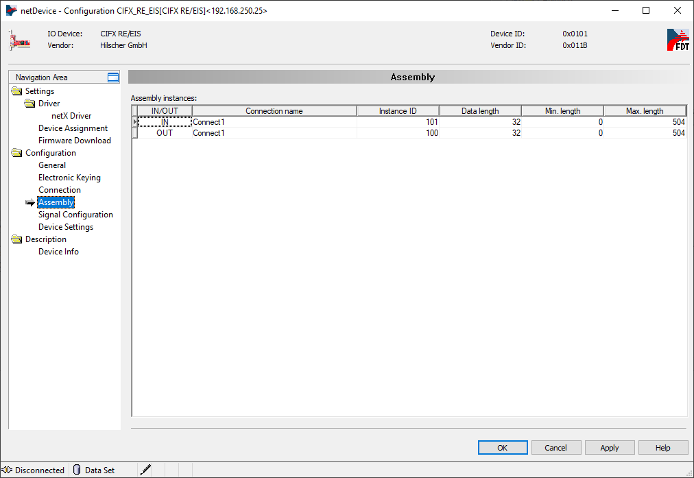 In "Configuration/Assembly" you can change the configuration of memory blocks for IN/OUT operations. By default, the Data length is set to 32 bytes. All subsequent PLC data blocks mentioned in this document are configured for 32 bytes. In case you need memory blocks of a different size, you can change the Data length from 0 up to 504 bytes.