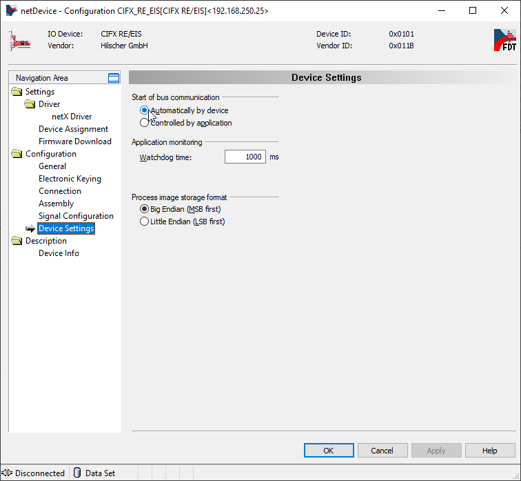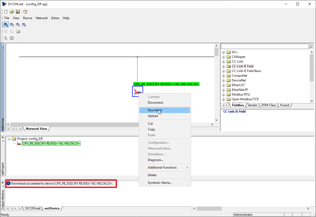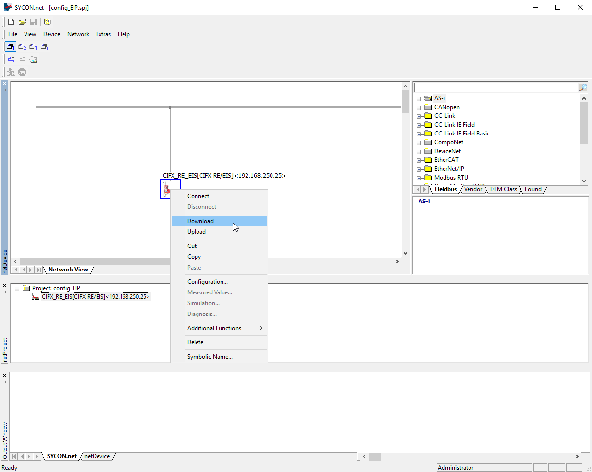 2. Make sure that the current program setting is loaded to the Hilscher card. If not please use SYCON.net application to connect and download settings to the devices as shown in the picture below.