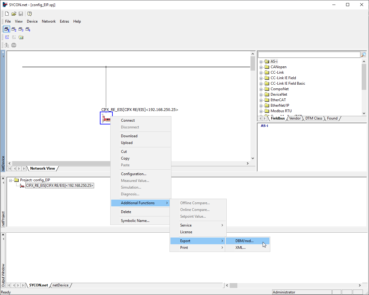 The final step is to generate configuration files for Aurora Vision Studio. You can do this by right-clicking on the device icon, then navigating to "Additional Functions -> Export -> DBM/nxd..", entering your configuration name and clicking "Save". You can now close SYCON.net for this example, remember to save your project before.