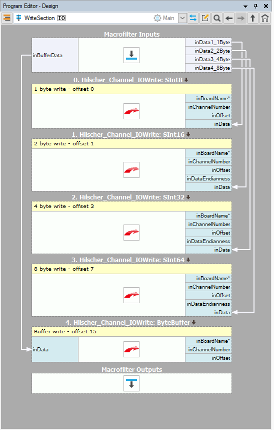 WriteSection step macrofilter has Hilscher_Channel_IOWrite filters (for instance Hilscher_Channel_IOWrite_SInt8) filters with adequate offsets and data types used to match PLC data variables configuration.