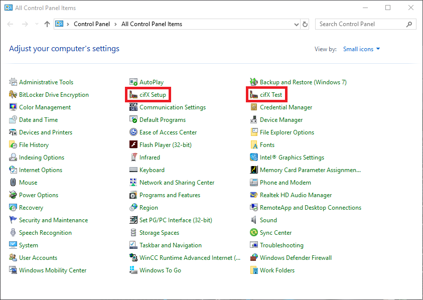 The easiest way to install the firmware to the cifX Driver is using the cifX Driver Setup Software. You can find tools for this software for instance using Control Panel menu as in the picture below.