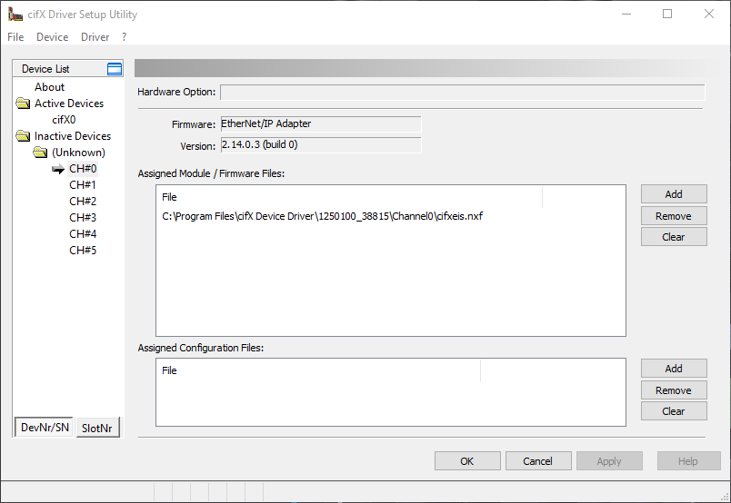 Using cifX Setup application select the channel you would like to configure (usually channel - CH#0) and remove preexisting firmware by clicking "Clear". Then click "Add" to add a new firmware file and navigate to the downloaded Ethernet/IP Adapter firmware (path \COMSOL-EIS V2.15.0.1\Firmware\cifX). Then click "Apply" and finish configuration with "OK".