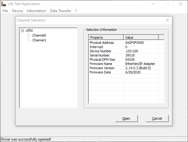 To be sure that firmware is installed properly you can open cifX Test software and then navigate to Device -> Open to achieve the result like below.