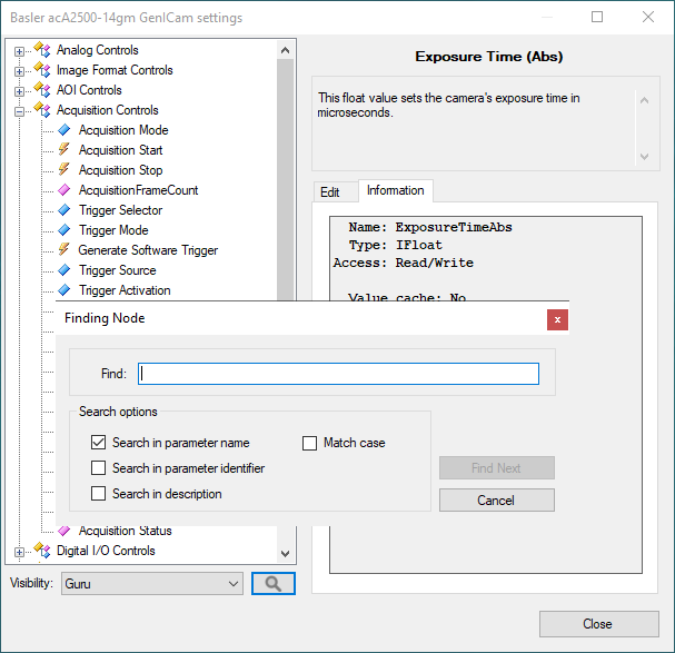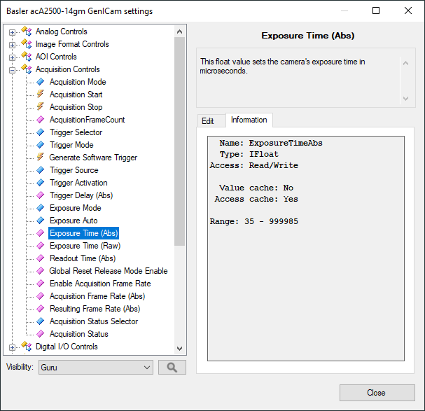 - Before closing the window note the minimum and maximum values of exposure time. After selecting the parameter, set the inValue to the lowest acceptable value.
