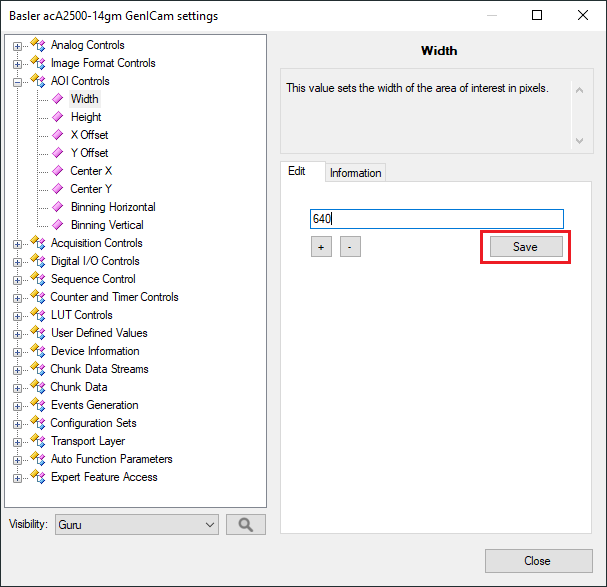 - Run the program and open the device tree (Tools -> Manage GigE Vision Devices...). Find the Width parameter. You will notice that the save button is grayed out due to running acquisition.