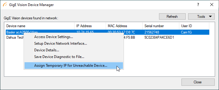 - If the camera is connected but not detected you may open the window (from point a), manually type the camera MAC address and assign it another IP address. The menu can be opened from the Tools menu.