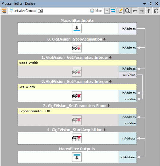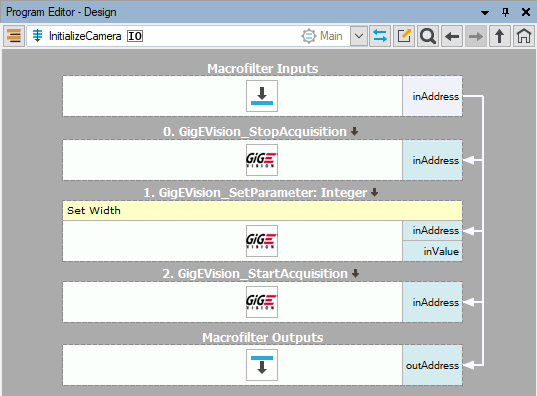 - In InitializeCamera add the three following filters GigEVision_StopAcquisition, GigEVision_SetIntegerParameter (select Width parameter) and GigEVision_StartAcquisition.