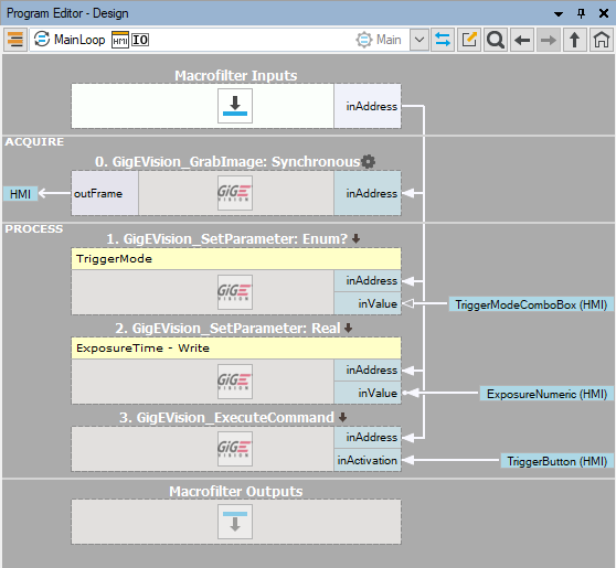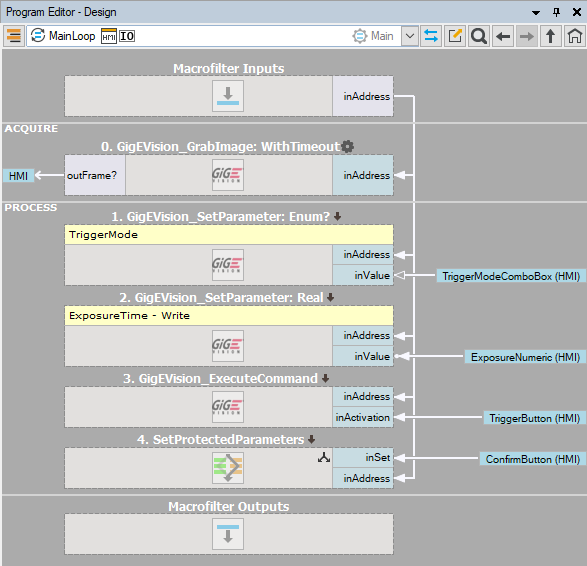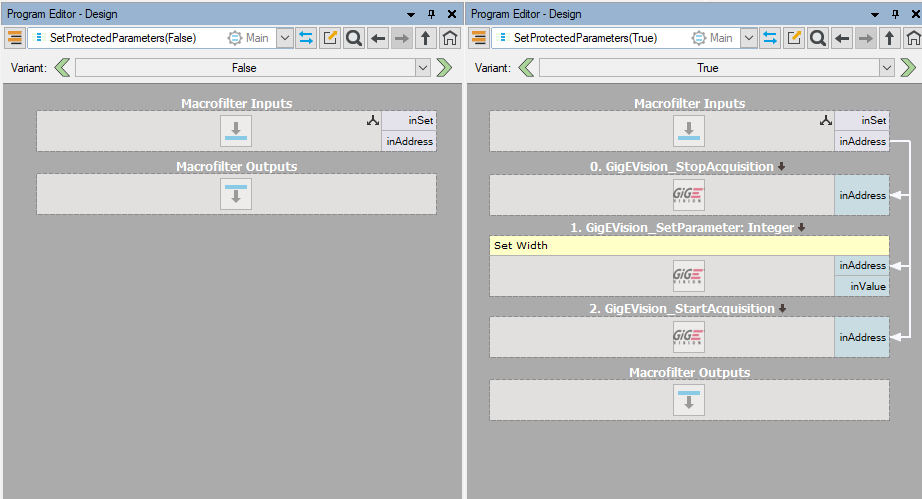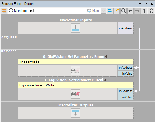 - Now add a GigEVision_StopAcquisition before the previous Set filter and rerun the program.