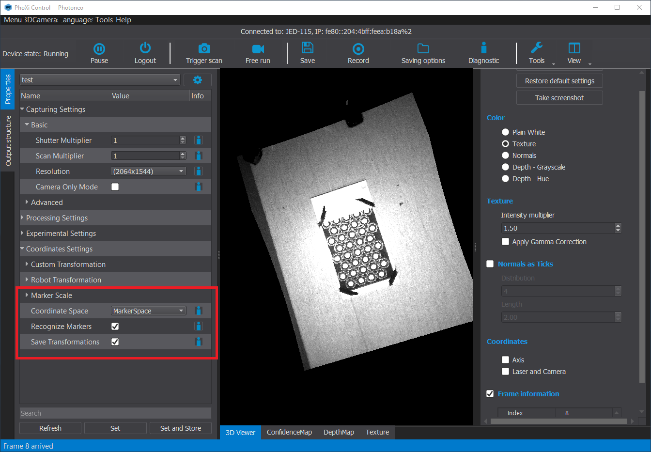 • Make sure you can grab point cloud in PhoXi Control application. If you cannot, please check connection and change the properties of acquisition.