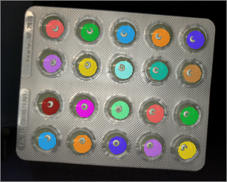 In this case pills can be easily found using high level tools for color analysis like CheckPresence_PixelAmount.