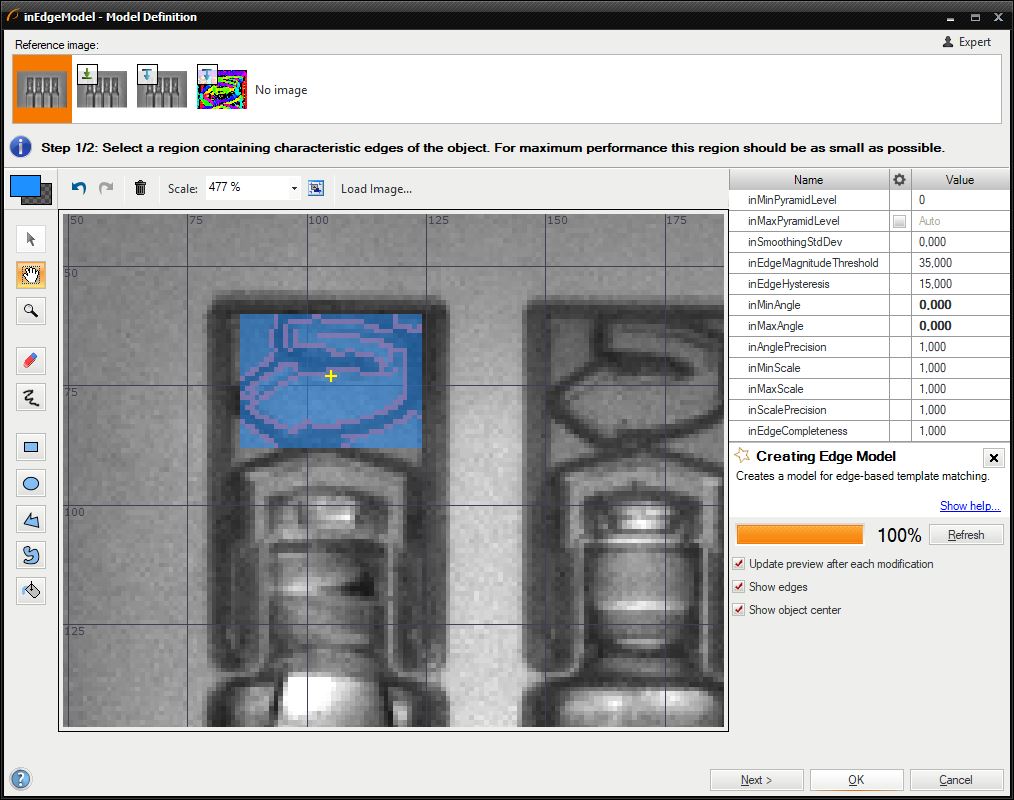 - The inEdgeThreshold parameter determines how strong the transition between pixels must be to be considered an edge. The inMinScore parameter determines the minimum score of a valid object occurrence. In this case we are only interested in finding the orientation of the cap, so the minimum score must be relatively low.