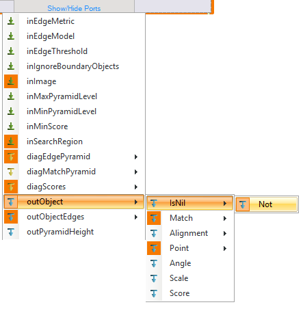 - By clicking on Show/Hide Ports you can show additional outputs and inputs. Check the option as shown in the following image, so that the filter has another output: outObject.isNil.Not.