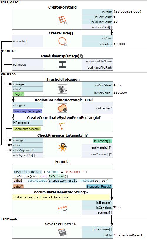 Put the outContrast value on preview window and iterate once the program. Note that if button is present, the contrast value is about 50. Otherwise it is about 10. Therefore set inMinContrast to 20. outIsPresent is an array of inspection results. Label that output as IsPresent.