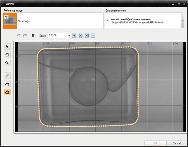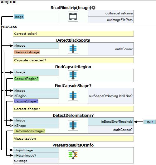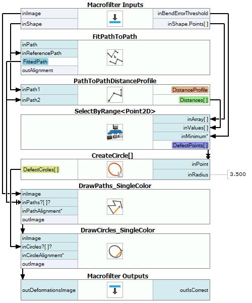 The task of macrofilters FindCapsuleRegion and FindCapsuleShape was to extract the contour of the capsule. The next step is to create Step macrofilter DetectDeformations. In this filter you will be computing the distance between outShapeOrNothing path and the model path. If the distance is higher than specified, the capsule is damaged.