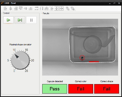The task is to inspect a quality of capsules and create a simple HMI. The following defects should be detected: black spots on the surface of capsule and deformations of its shape.