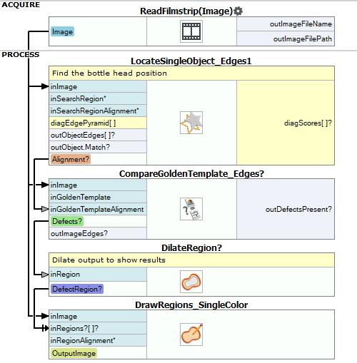 Configure the CompareGoldenTemplate_Edges filter with the same values as in Golden Template Editor. Set inEdgeThreshold to 30.0 and inEdgeHysteresis to 20.