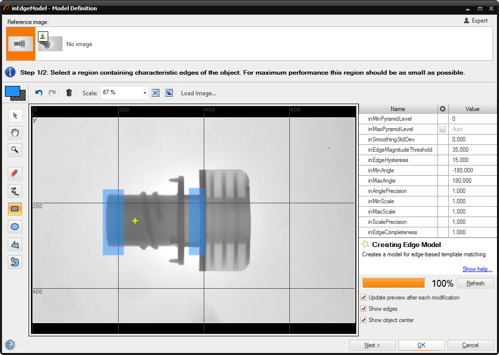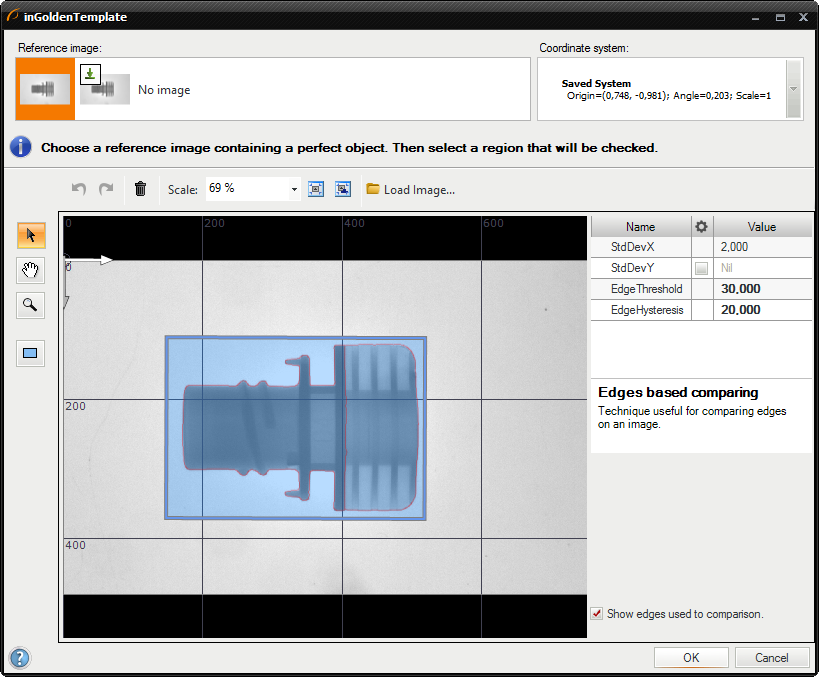 Using the Golden Template Editor select a template on the first image. Set EdgeThreshold to 30 and EdgeHysteresis to 20.