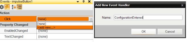 Now you need to create two Event macrofilters using OK and Configure... buttons. To do so, press the second one on the HMI and go to Events window to create a new event handler for Click action. Set its name to ConfigurationEntered: