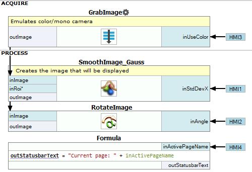 Create a separate Step macrofilter for loading a test image in a loop. Then add a variant macrofilter with two variants in accordance with a current active page in the HMI.