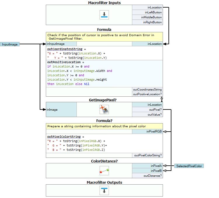 outPixelColorString = "R = " + toString(inPixelRGB.X) + " G = " + toString(inPixelRGB.Y) +Connect this output to the inText of the Label HMI Control (the one that is placed under the Pixel Color:).