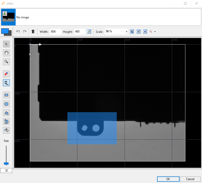 Add the ThresholdToRegion filter. Connect outImage from the previous filter to inImage of the current one. Set the inRoi input as follows: