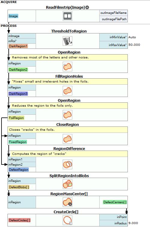 - Add FillRegionHoles filter to fill small holes in the foils which should not be considered as defects. Set inMaxHoleArea to 10.