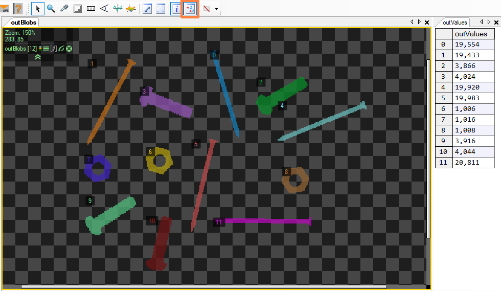 - If you display the outBlobs output on the preview window and outValues on another one, please note that you can click on the button