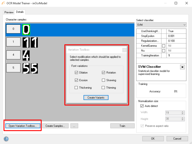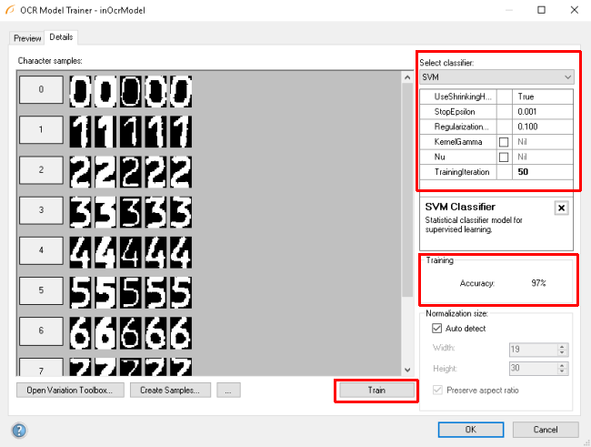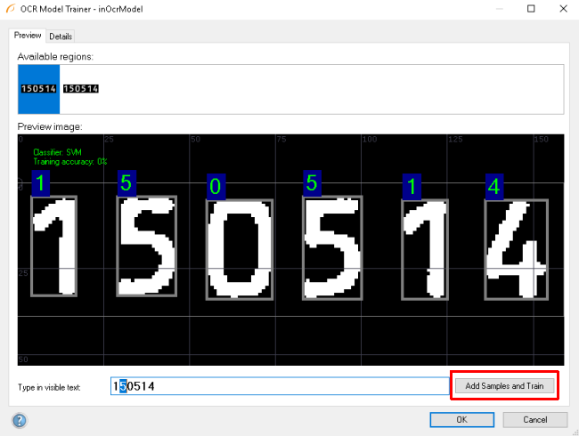 Click on the ReadText filter and choose inOcrModel. In the OCR Model Trainer you need to specify the value of each extracted character. When you are done, click Add Samples and Train: