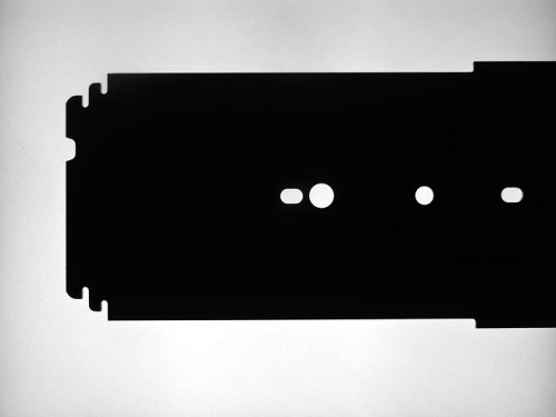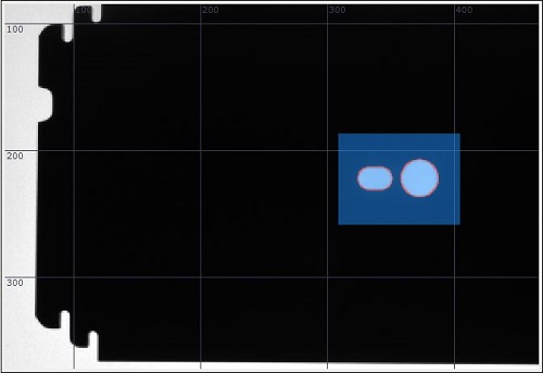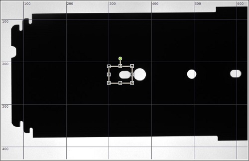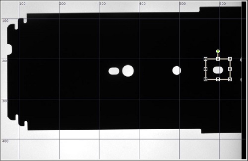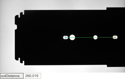 Location of object is variable. To find object's holes combination of Region Analysis and Template Matching techniques can be used. To do measurements, which are independent of object orientation, CoordinateSystem2D connected with a object location must be prepared. Use LocateSingleObject_Edges1 to create reference CoordinateSystem2D and then use Region Analysis technique on the selected ROI.