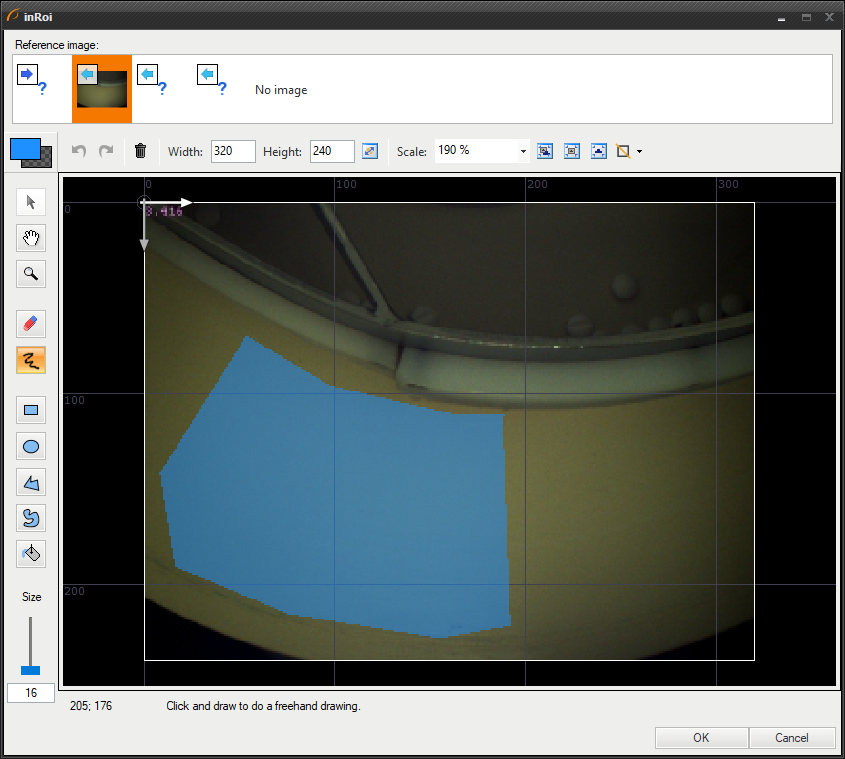 - Click on the CheckPresence_EdgeAmount filter and select inRoi parameter in the Properties window to mark the region as on image below: